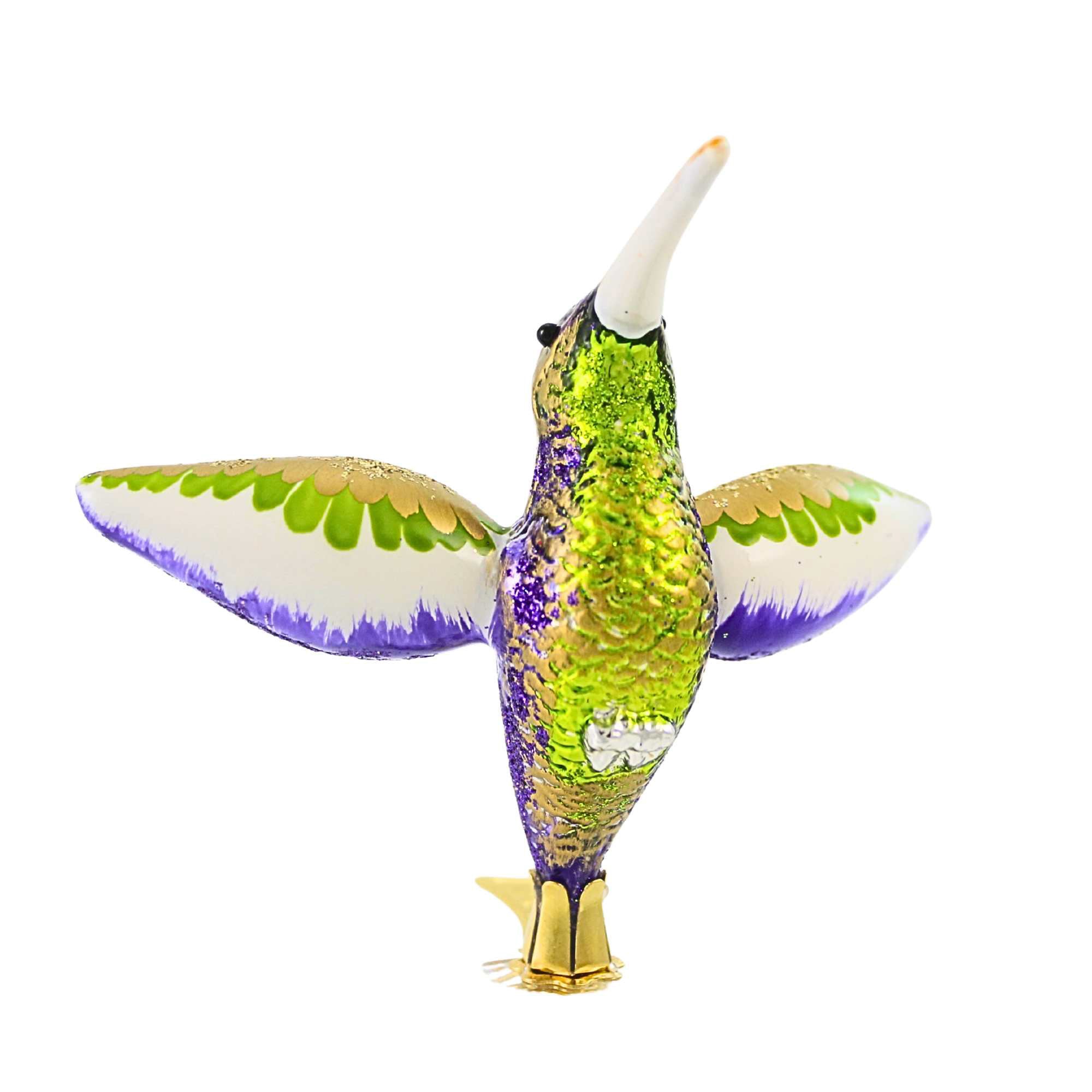 Add a graceful sparkle to your décor with the Hummingbird Clip-On Ornament from BluBom. Measuring 4.75 inches, this exquisite glass ornament is 100% handmade using premium materials and finished with delicate hand-glittered details. The secure gold clip makes it easy to attach to trees, wreaths, or garlands for instant elegance. Created by skilled designers and artisans, each piece is a miniature work of art that brings beauty and charm to any setting.