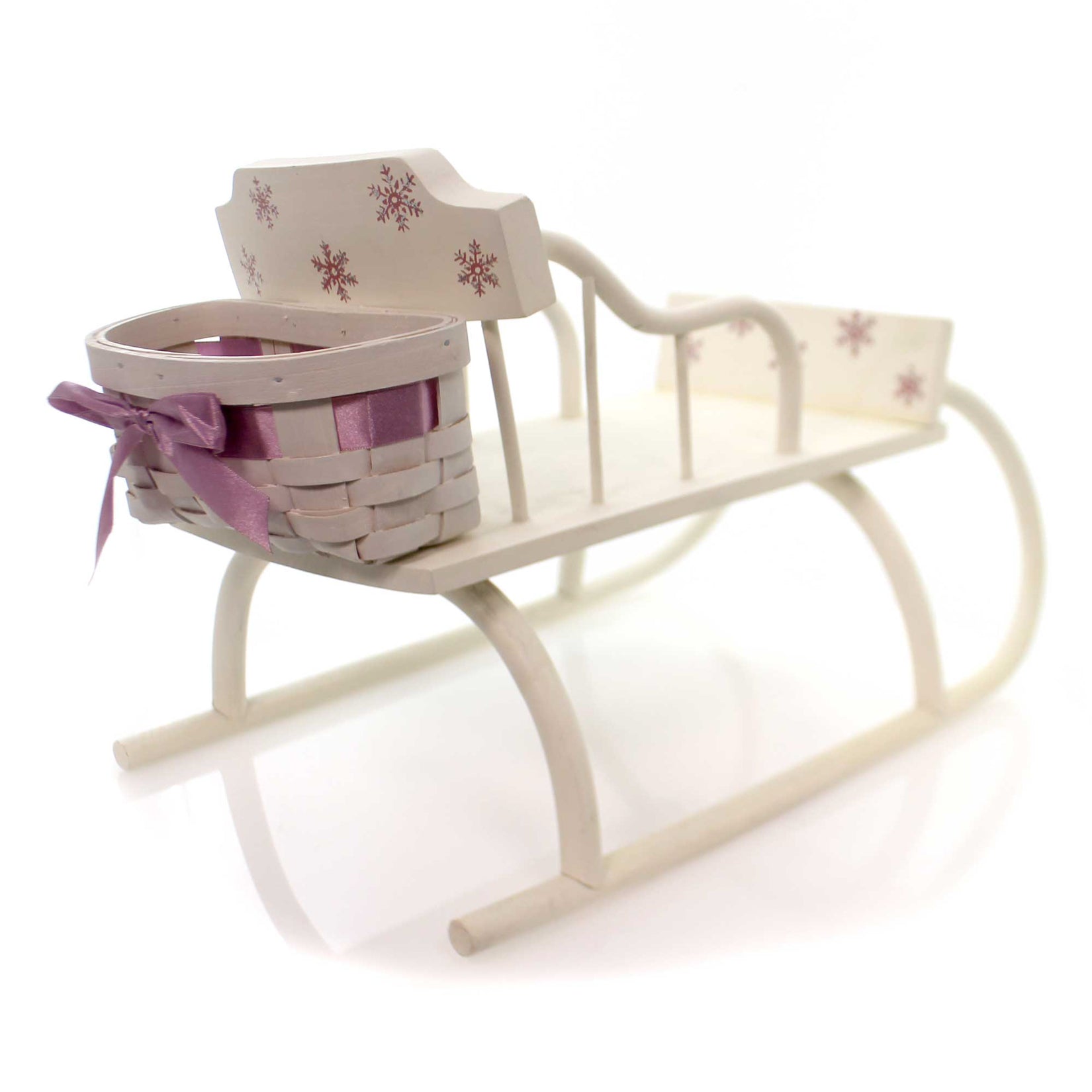 - Whitewashed wooden sleigh has lavender snowflake accents and a pretty wicker basket on the back with a lavender silk bow woven at the top.