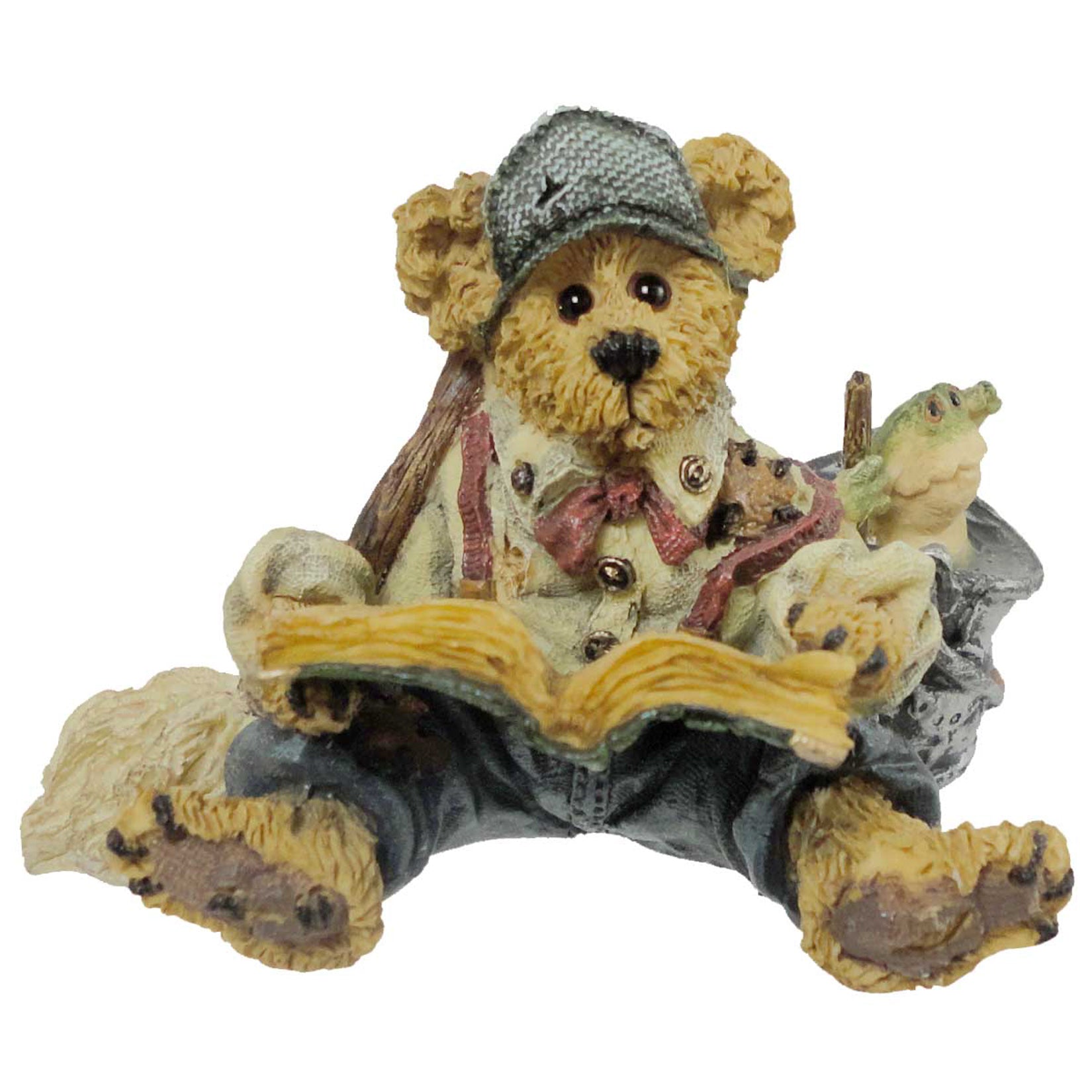 - Little bear reading a book with a mop and bucket with frog inside beside him.