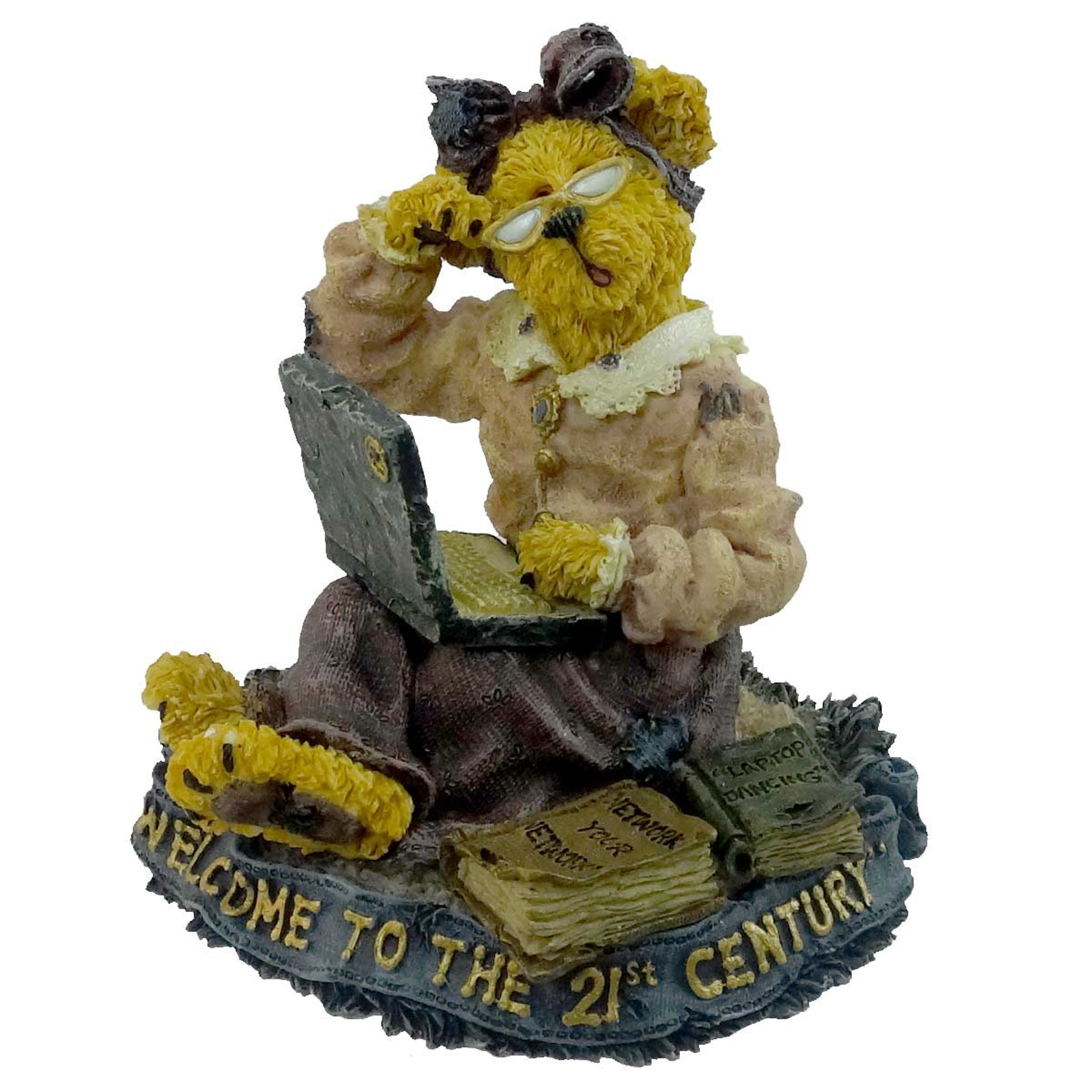 - Bear with glasses wearing a plum dress with a rose colored jacket with lace collar holding a laptop computor.