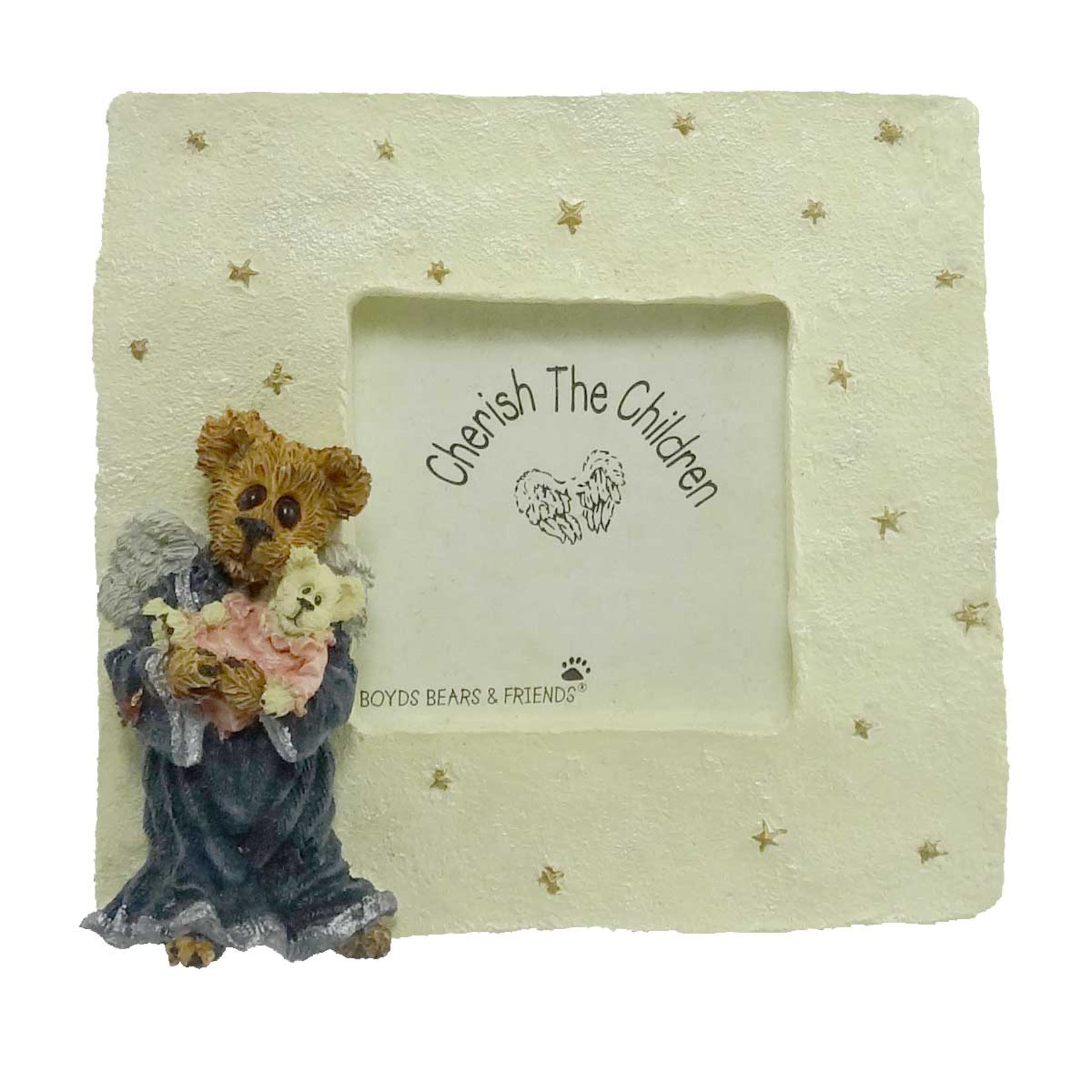 - Mini white frame with gold stars and an angel bear holding a small baby bear.