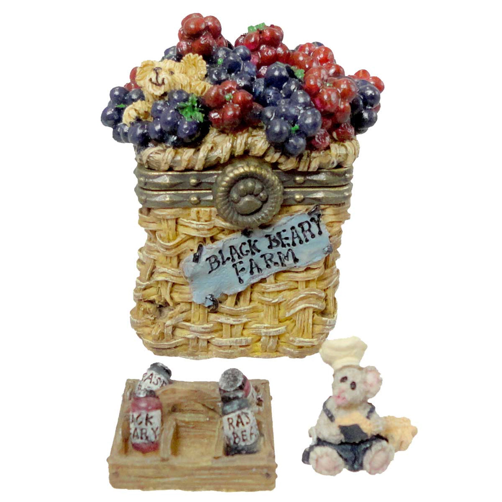 - Basket filled red and black berries and a little bear peeking out the top.