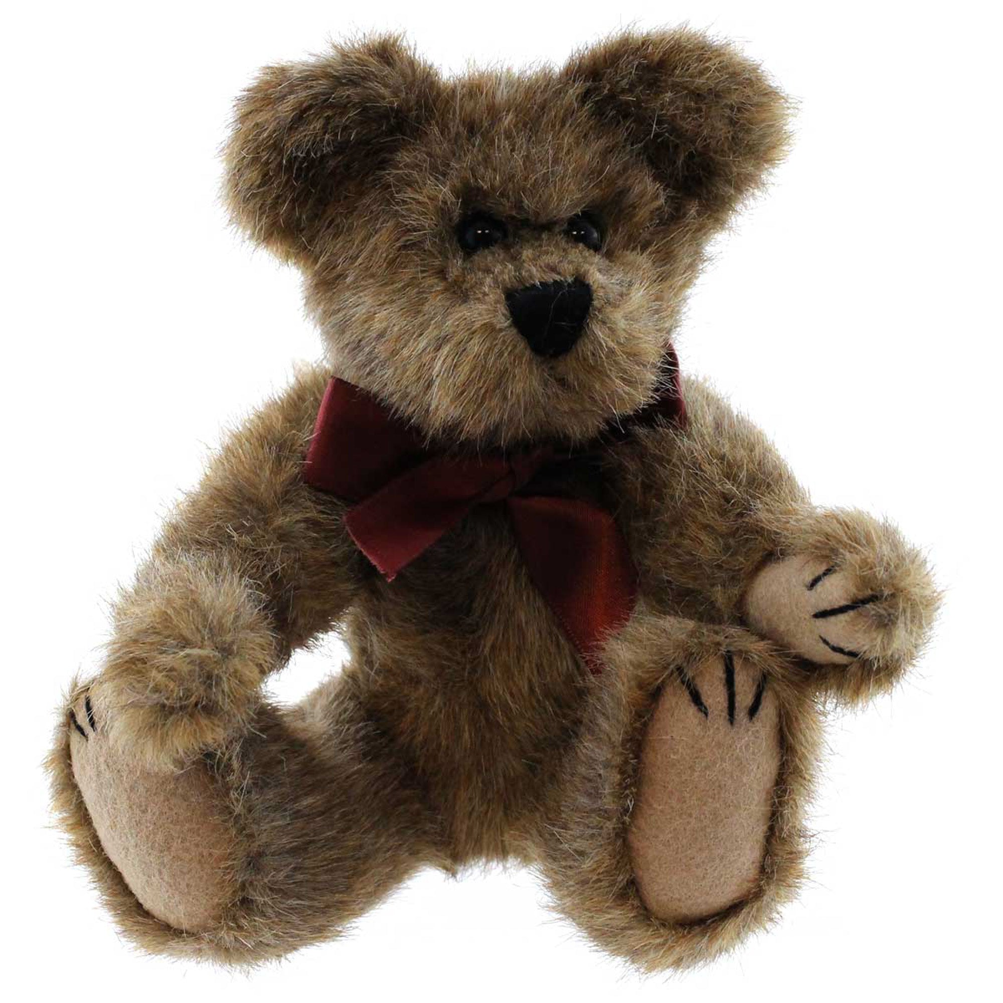 - Mocha bear, fully jointed poly filled, emboirdered paw pads wears a satin neck ribbon.