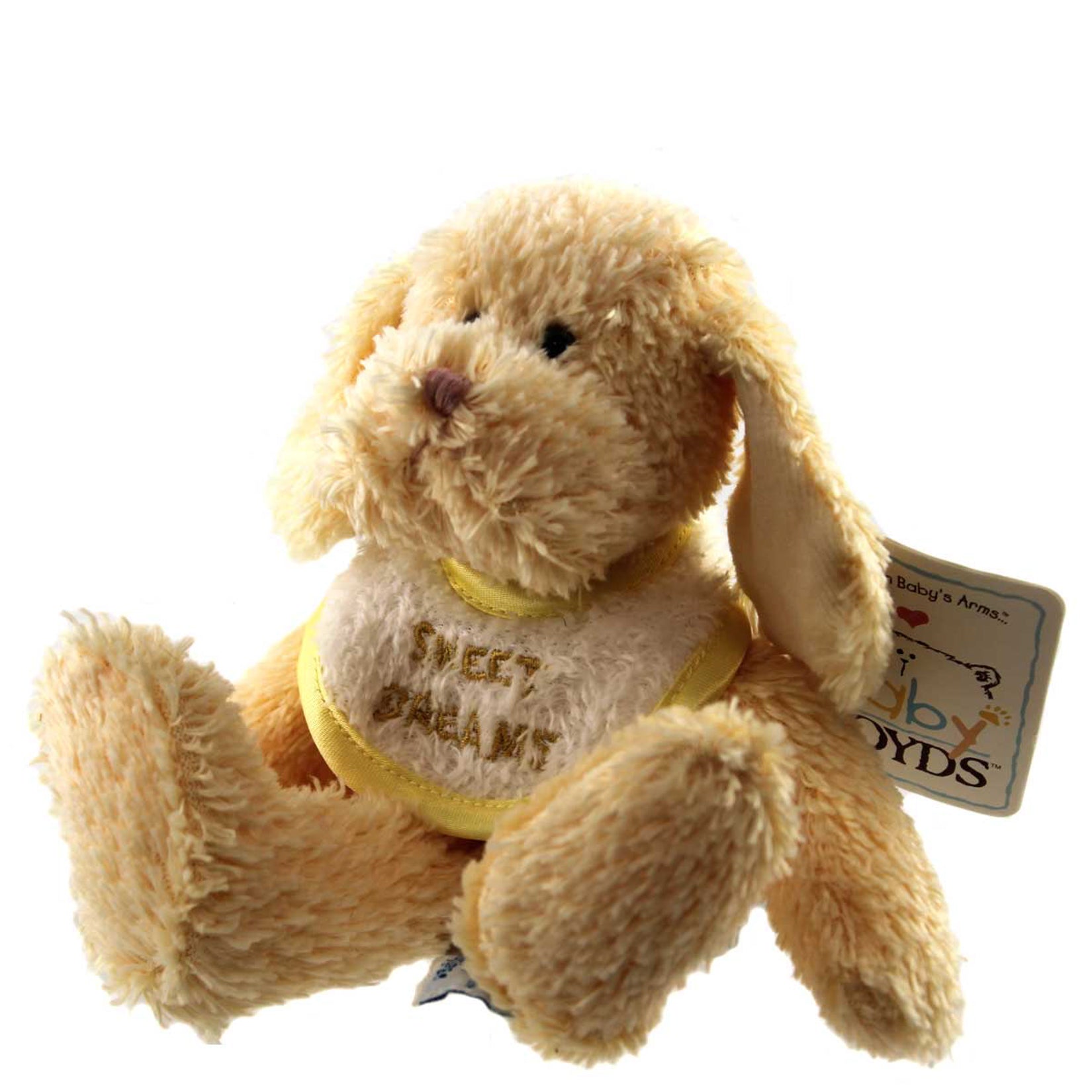 - Soft yellow string chenille dog wears a white terry bib with yellow satin trim. Bib is embroiderd with "SWEET DREAMS" on the front.