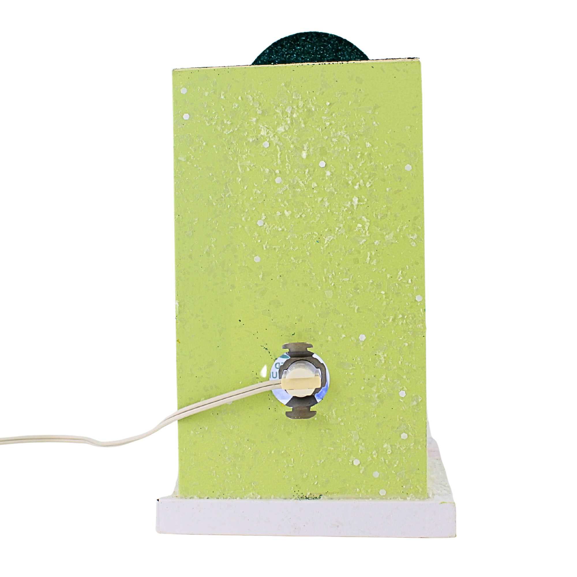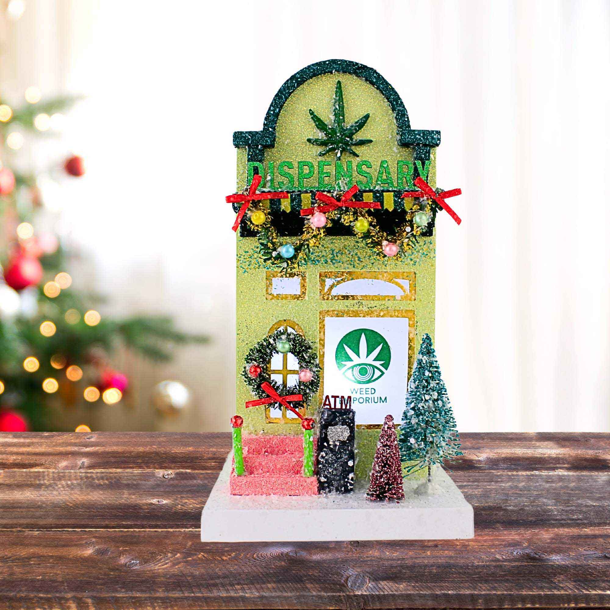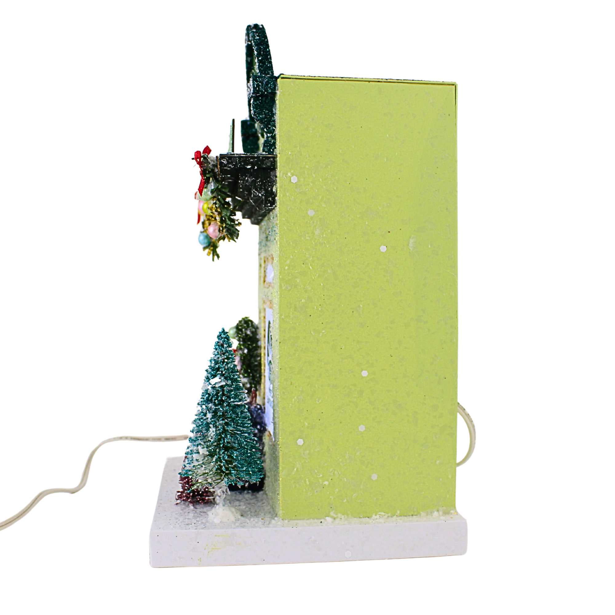 Bring whimsical holiday charm to your home with the Cody Foster Dispensary Putz Christmas Building. This festive green structure features gold-trimmed windows and door, cheerful pink steps, a classic wreath, and bottlebrush trees that create a cozy, nostalgic scene. Beaded garland drapes across the awning, adding sparkle and personality to your Christmas village. A small opening in the back allows optional lighting, letting the warm glow shine through the windows and bringing the charming display to life.