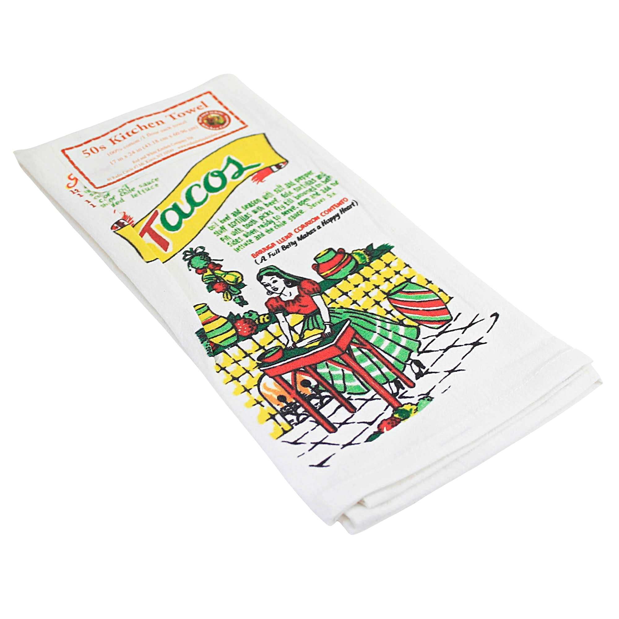 A Retro Inspired Decorative Kitchen Towel Of 100% Cotton With A Latina Woman Sharing Her Taco Recipe In Traditional Mexican Kitchen.