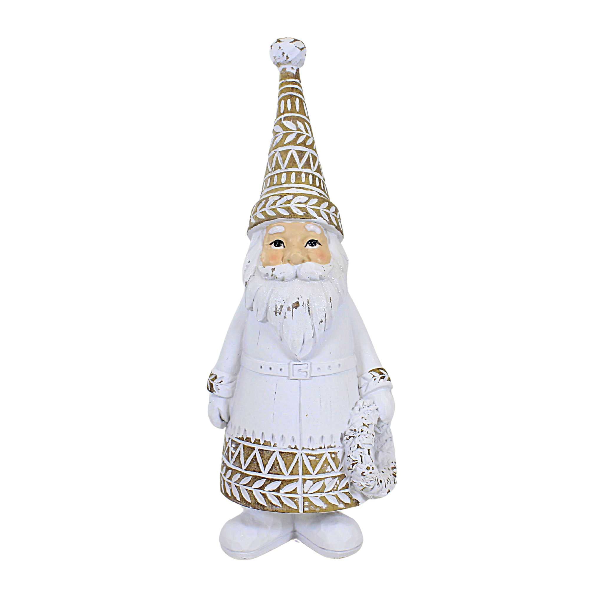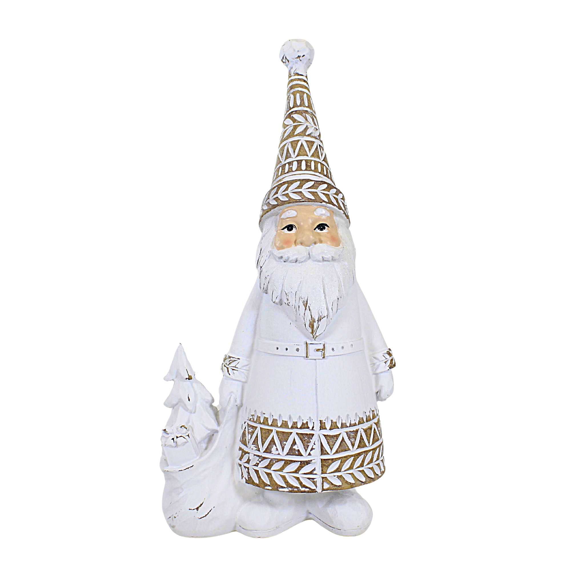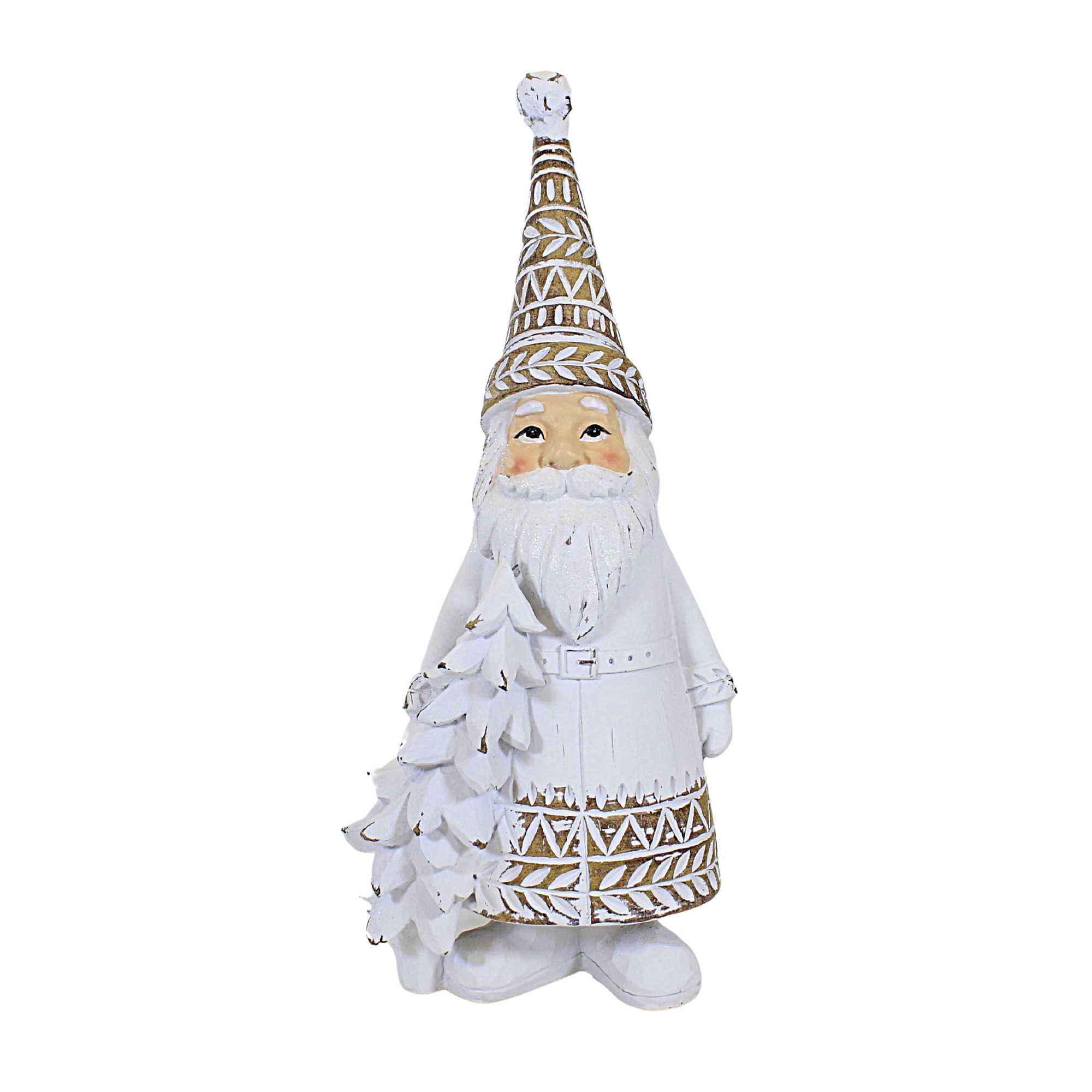 This unique Santa features a white coat with a tan trim and matching hat, accented by a whimsical white-wash design. Perfect for adding some Christmas cheer to any room.