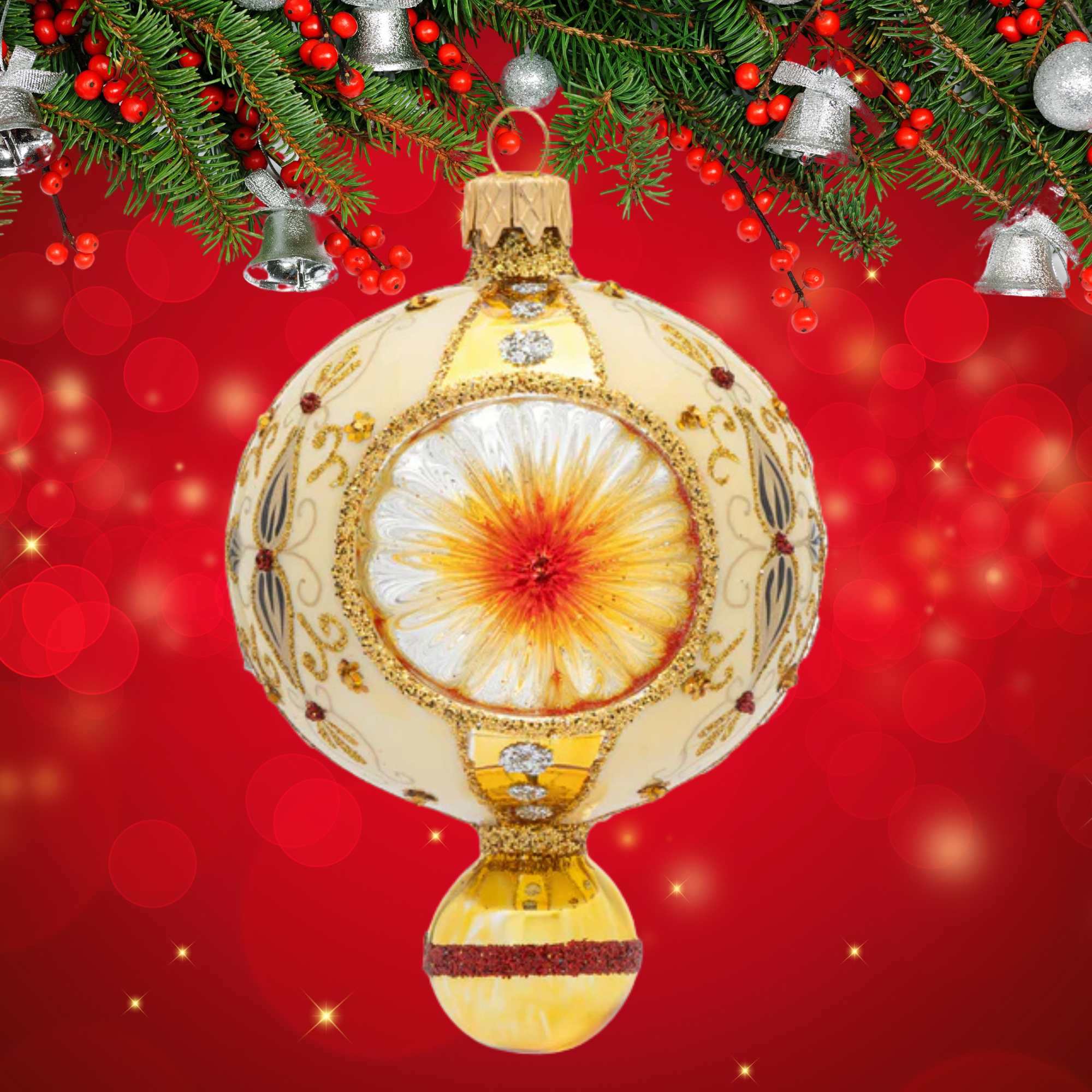 The Chatham Reflector Drop In Striped Gold Ornament by Miss Christmas brings timeless elegance and festive sparkle to your holiday decorating. Hand-blown and hand-painted by skilled artisans, this 5-inch glass ornament features rich red crystals, shimmering gold stripes, and soft glitter that catches the light beautifully. Each piece is a work of art, combining luxurious craftsmanship with holiday cheer. Whether it's a new addition to your ornament collection or a standout piece on your tree, it’s sure to be a favorite for seasons to come.