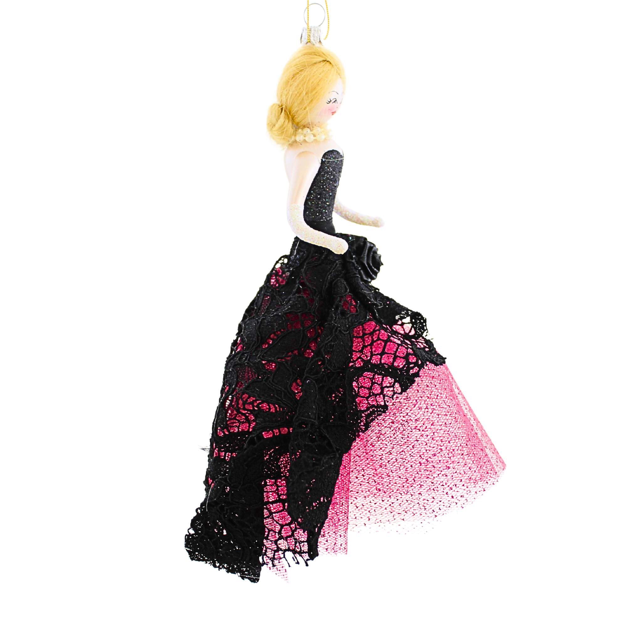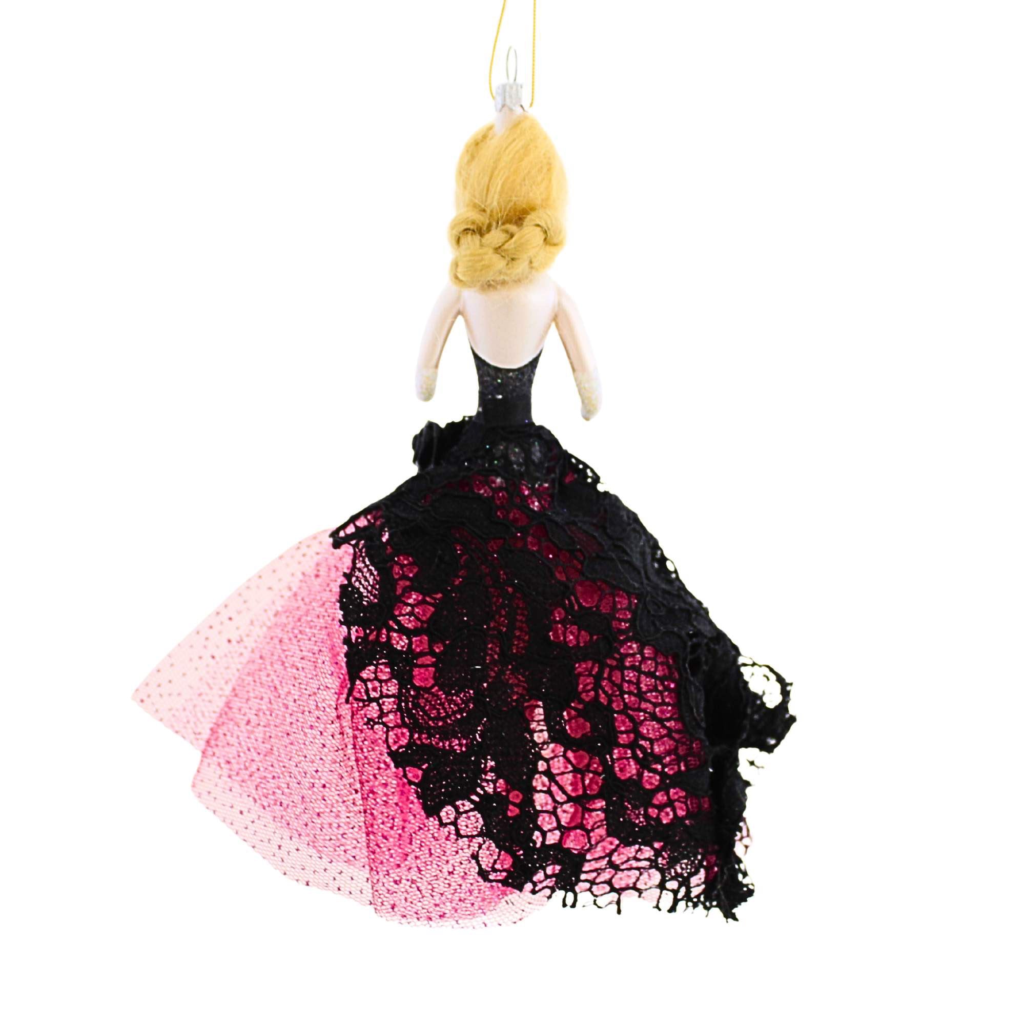 Princess Amelia in Gown is elegance with a flair for drama, making her a standout addition to any holiday collection. With soft blonde hair in a formal updo and a couture gown featuring a sparkling black bodice, lace skirt, and playful hot pink tulle underskirt, she’s pure ornament royalty. Her layered pearl choker adds a touch of regal charm to her glamorous look. Handcrafted in Italy by De Carlini, this 6.50-inch glass ornament captures timeless beauty with exquisite detail and style.