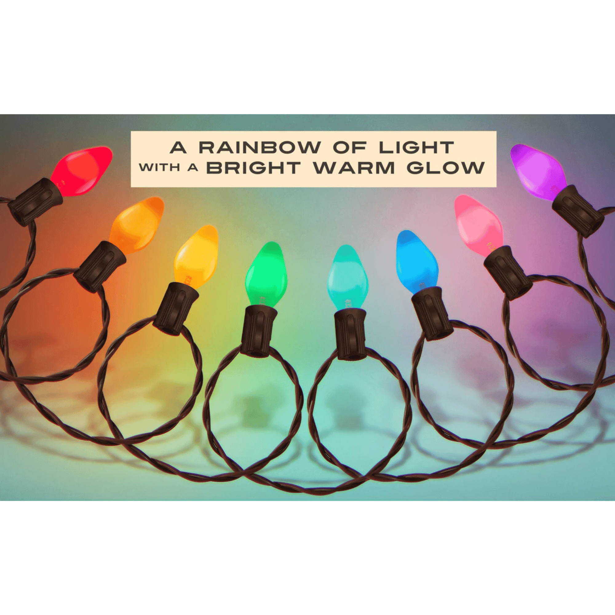 Brighten your holidays with the Tru-Tone Spectra Rainbow 24 Light Set. Each C7 glass bulb shines in a vivid rainbow of retro colors, capturing the warmth and charm of vintage Christmas lights. With ultra-flexible twisted pair wiring and energy-efficient LED filaments, these lights deliver classic glow with modern reliability. Perfect for indoor or outdoor decorating, this cheerful set brings nostalgic brilliance to any festive display.